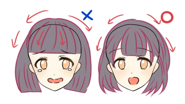 在头发的描绘方法中,首先要意识到的是头发的流向。人的头发像是从辫子里掉下来一样流动。在画头发之前先戴上角色的头部顶点(鞭子)的形状。然后把刘海和后发的边缘的位置,从手指头降到刘海、后发的前端,把这个也戴上雅达利吧。
