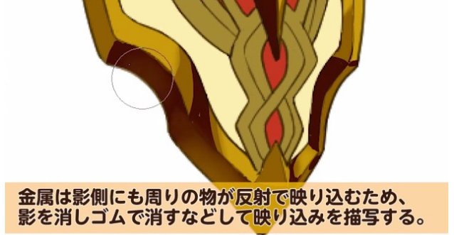 在大致的阴影结束后,把金属映照出物体的描写放入其中。