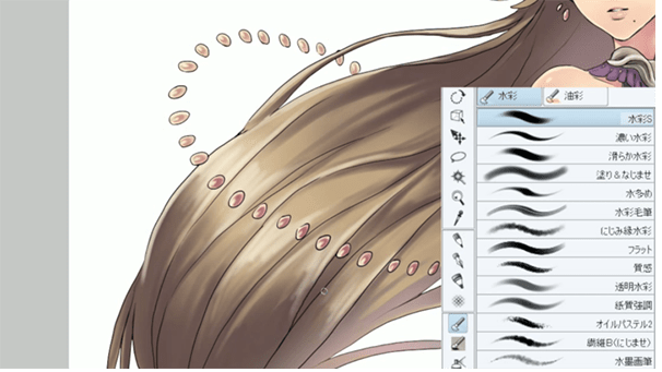 用细的刷子,用意识到每一根头发的笔触,以膨胀的部分为中心进行描绘,然后用粗的刷子涂抹,这样就能产生立体感。
