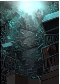 一边意识到从上面照射的光线,一边将书架和树木画得淋漓尽致。从早期开始一边想象完成图一边描绘是很重要的。