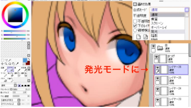 然后将新图层裁剪到瞳孔的基础图层上,使合成模式发光,并重叠明亮的颜色。