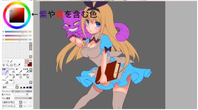 涂衣服的白色部分。白色部分用白色和灰色表现的话会变得乏味,所以用含有紫色和红色等的颜色涂抹。