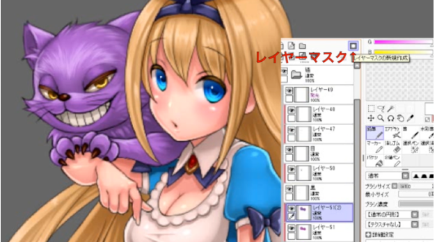我来介绍一下使用图层面膜涂抹的技巧。把涂上粉色的猫的尾巴的一部分变成紫色,做成条纹。