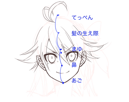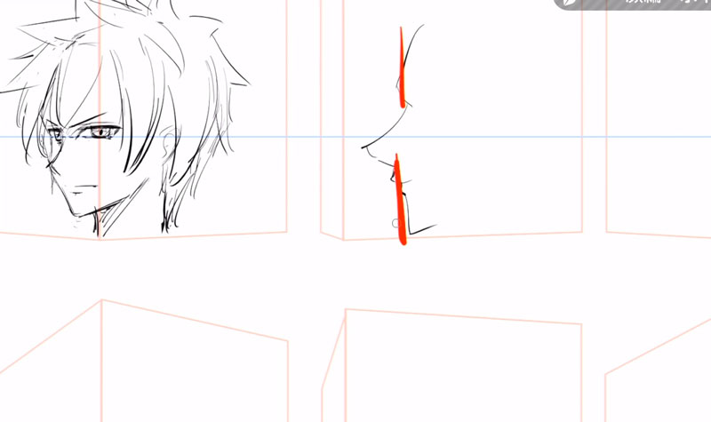 眼、鼻、口之间的间隔比正面的情况窄,相应的尺寸也会变小。各零件的形状也会发生变化,所以要注意画出来。