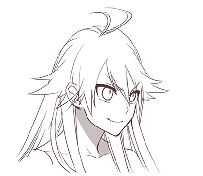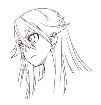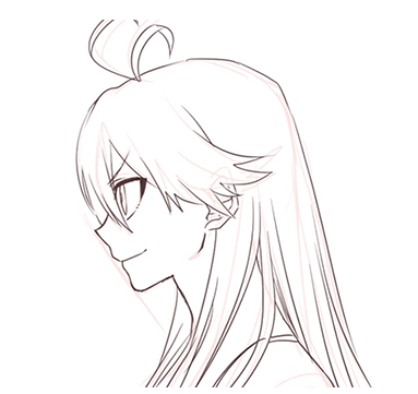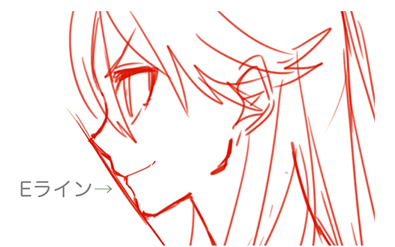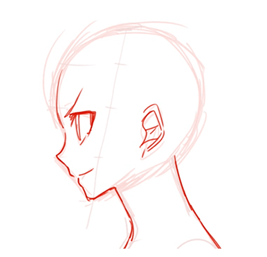 不是以额头出现为特征的角色时,为了不太出现额头,画一张侧脸。鼻子下面的线条,和额头一样,或者鼻子下面的线条往前走,看起来更自然。另外,下唇比上唇缩进来的话会看起来很漂亮。