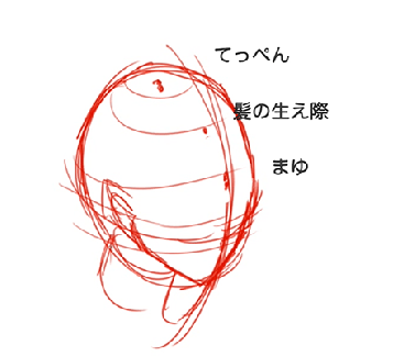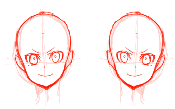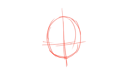 正面的脸,首先画出纵长的椭圆,在中心画纵线,再画出决定角度的横线。在这里画正圆会造成头部部分变大的原因,所以要注意的是。