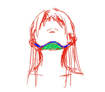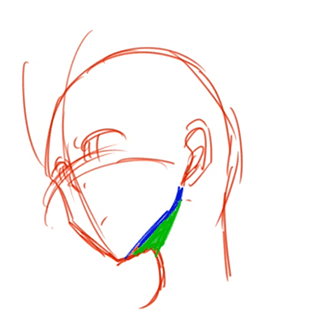 如果你从正面看向上的人,你会发现,从正面看时轮廓的线条(蓝线)与脖子并不直接相连,而是用绿色表示的面连接在一起。