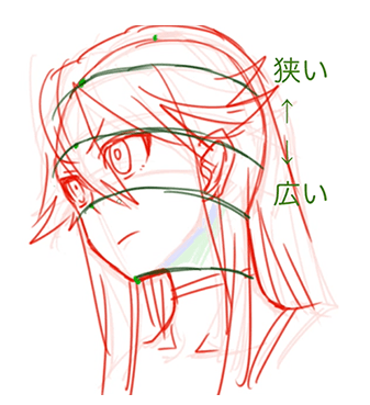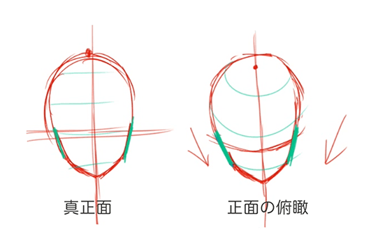 因为煽动的情况是从下面看的,所以头部的顶部、头发的发际线、眉毛、鼻子、下巴的配置比率和从正面看的时候相比,越往上越窄,越往下越宽。