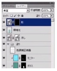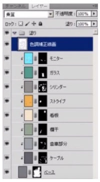 在其上新建每个部件的图层,并为其设置剪切蒙版。每一层都用各自的绘图颜色填充整个表面,然后添加图层蒙版,并设置实际显示的范围。