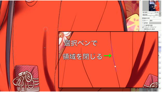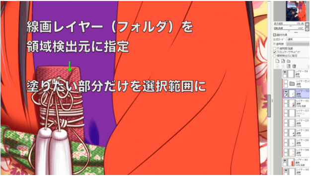 指定线条图层(文件夹)作为区域检测源,以便不突出到其他部分,并将您想要填充的部分涂在选择范围内。