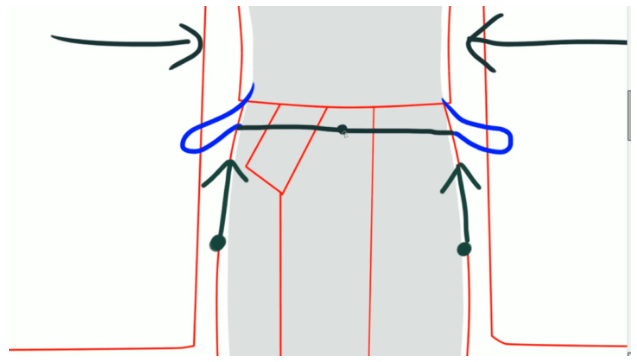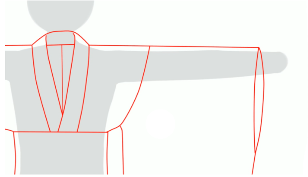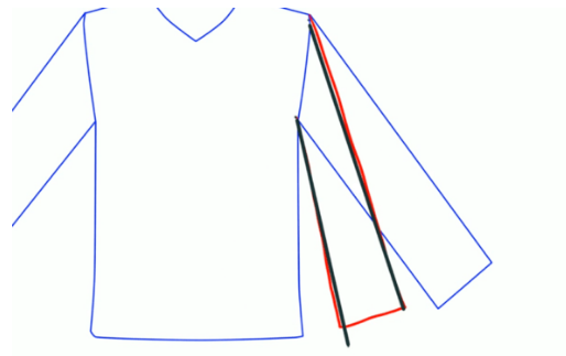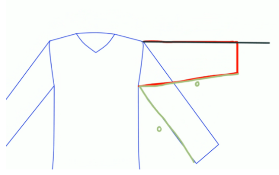 我用红线画了抬起手臂时的袖子。绿色的袖下部分的长度几乎没有变化。你可以看到上面的部分比原来长度的黑线短。