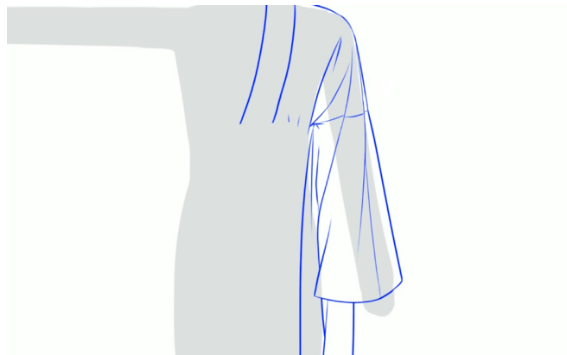 让我们来看一下手臂稍微弯曲的情况。弯肘的话袖子的前端会抬起来,布靠在肘部,从腋下起皱。