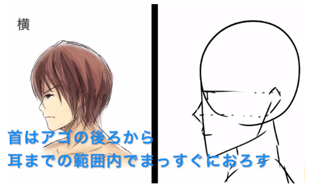 脖子从下巴后面到耳朵后面,笔直地向下画。