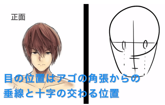 眼睛的位置在从下巴的拐角处发出的垂线和十字旁边的交汇位置。