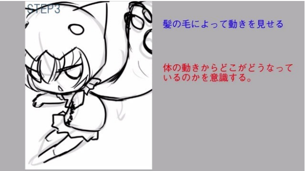 头发是可以大幅移动的部分。手臂抬得很大,就是整个上半身都被扭了起来了。让我们用头发很好地表现那个吧。