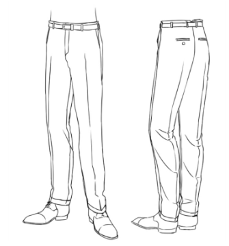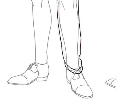 从膝盖到下面要有意识地画出重量的样子。下摆画得有一个软垫松弛,把鞋背稍微包起来。