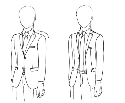 从胸前口袋的中间到腰口袋的内侧四分之一的位置画出被称为前飞镖的针脚。