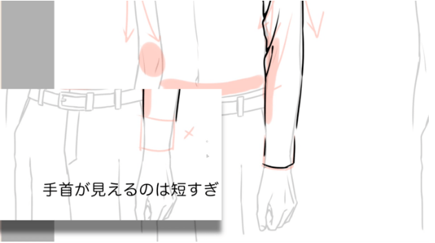 弯曲手臂会以肘部为顶点产生皱纹。袖口会先变细,所以画成梯形吧。