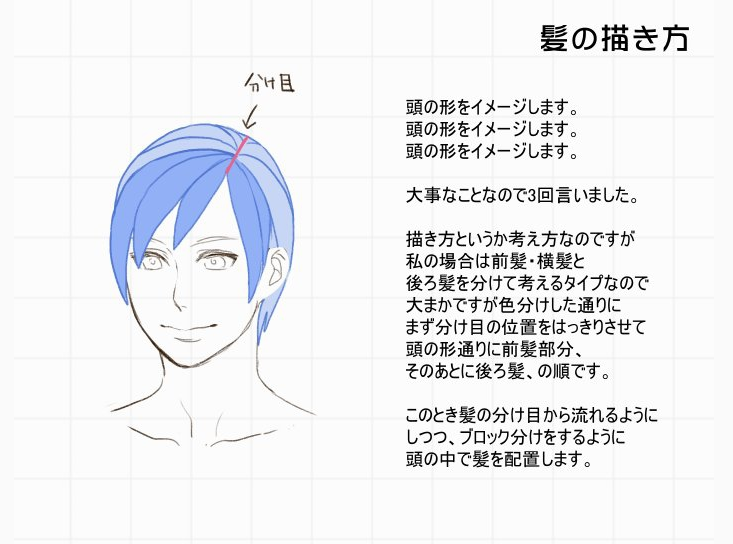 头发的画法分开且想象头部的形状。因为很重要,所以说了三次。虽然是绘画的想法,但是我的情况是刘海和侧发因为是分开考虑后发的类型,所以大致是按照颜色来区分,首先明确分开的位置,然后按照头的形状是刘海部分,之后是后发的顺序。此时,一边使头发从头发的分界处流出,一边像分块一样在脑海中配置头发。