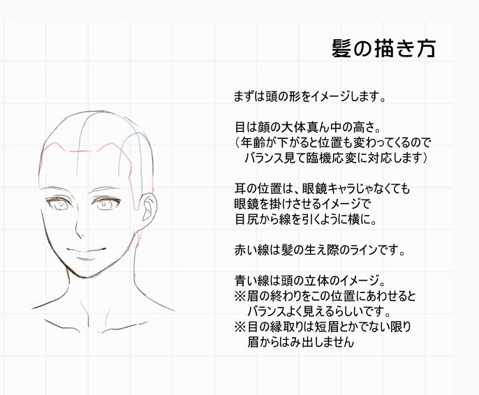 眼睛大概在脸中间的高度。(随着年龄的增长位置也会发生变化,所以要看平衡随机应变)耳朵的位置在旁边,就像即使不是眼镜角色也会让他戴眼镜一样,从眼角画线一样。红线是头发边的线。蓝线代表头部立体的形象。将眉毛的终点对准这个位置,似乎看起来很平衡。 眼睛的边框除非是短眉之类的,否则不会超出眉毛