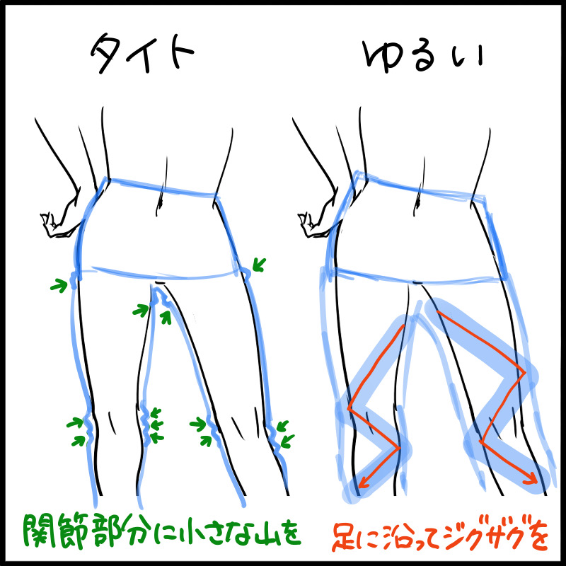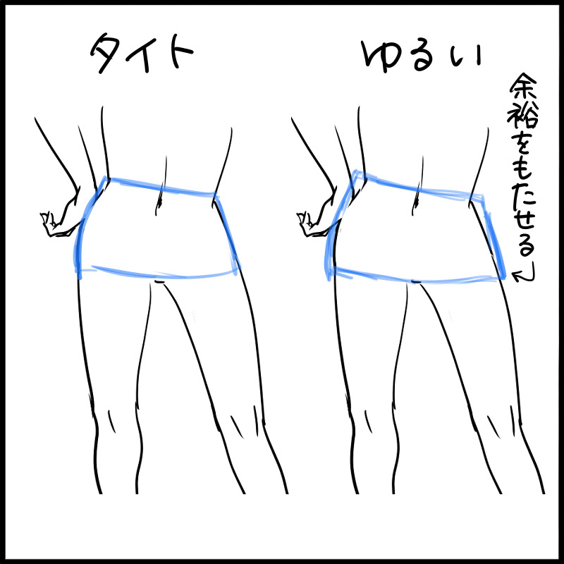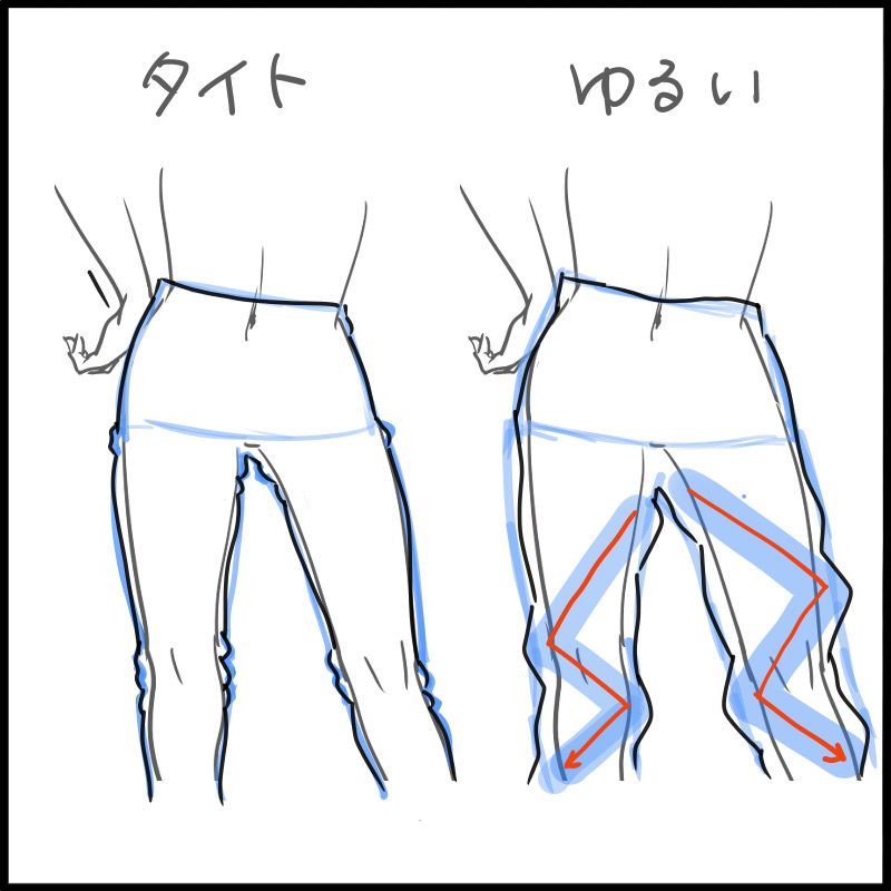 如果松了,可以整体画褶皱,但是布料会因为重量下垂,所以请统一褶皱的方向来表现。