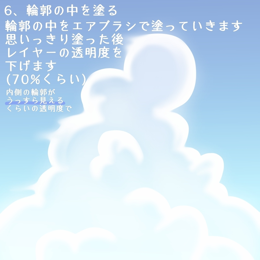 6、涂在轮廓中用喷笔在轮廓中涂抹。充分涂抹后降低图层的透明度( 70%左右)内侧的轮廓隐约可见透明度差不多