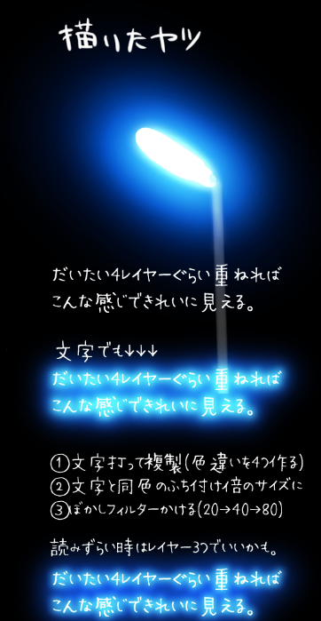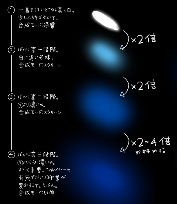 最亮的地方使用白色,每过一个步骤颜色逐渐变浓变暗,以此表现出光的扩散以及衰减。这次尝试用4个图层来画。请根据自身喜好来增减图层。
