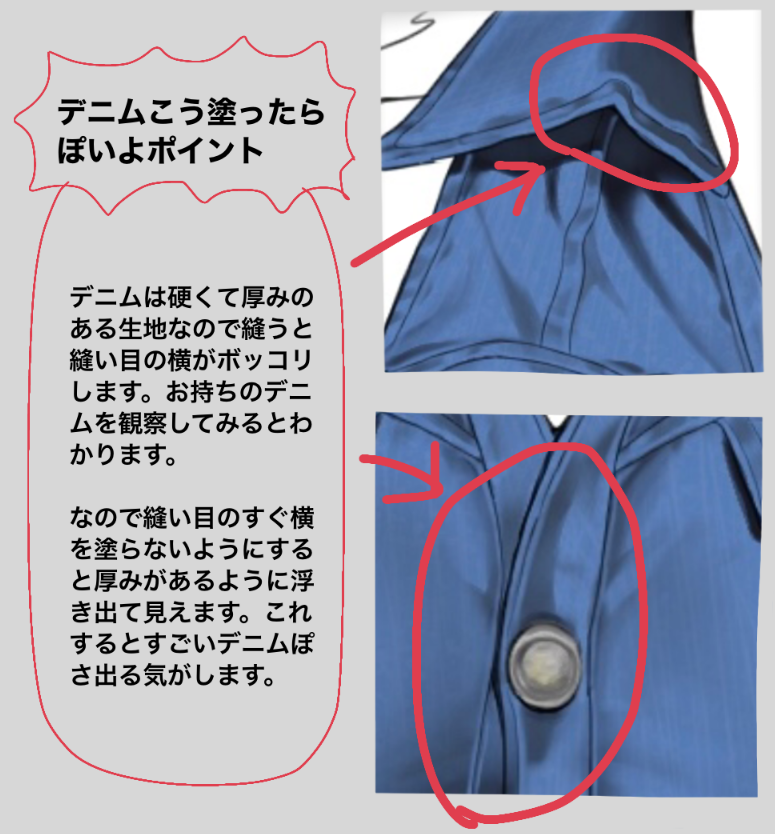 牛仔裤一擦就会掉色。所以质地的边缘要涂白色。比起一直涂,中途中断或者稍微变粗糙的话会更有de2m感。