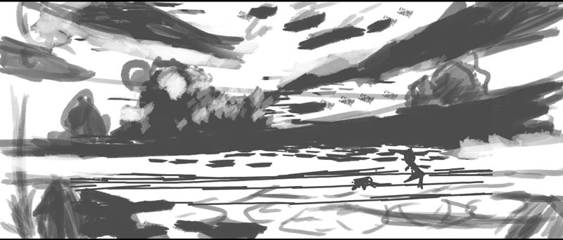 首先打草稿,这部分需要注意的是线条的走向,毕竟线条的走向决定了观看者的视线移动。可以用半透明的笔刷叠出黑白灰,叠出明暗对比,顺便想象自己要画的画面。
