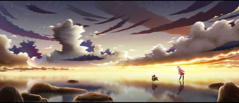 备份井合并天空场景的图像,复制合井后的图像使其上下翻转,然后调低透明度的橡皮擦,将近处的图像轻轻擦去一点,稍微透出水的颜色,这样水面就ok了