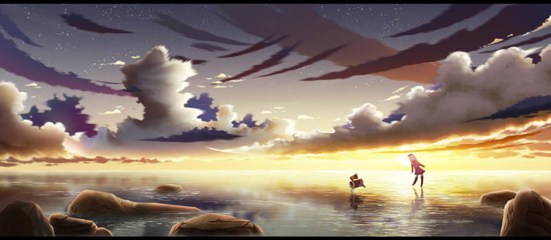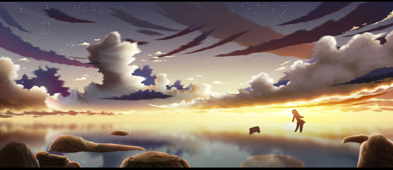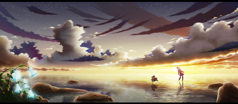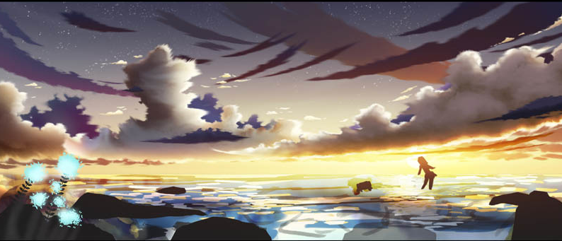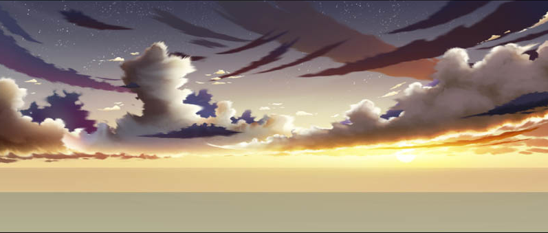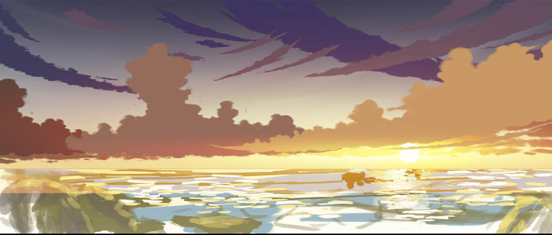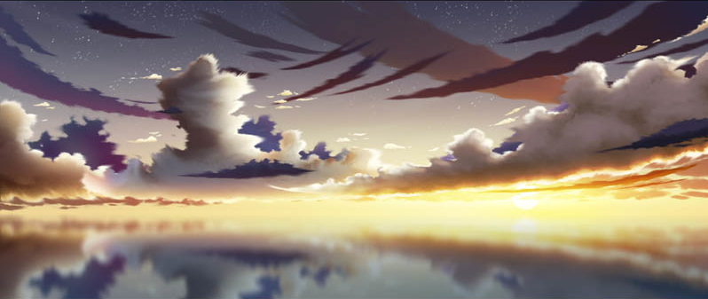 这里先进行天空的描绘,将上一步画好的色块形状进行修整。太阳光的效果,可以通过画一层光线将过滤模式改成叠加,复制几次,根据个人喜好调整光线图层大小和图层的混合模式(线性减淡和颜色减淡混合使用,具体要看使用的颜色和画面的效果)。画好太阳光后将图层分散于云朵色块的前后,以塑造一种远景更亮的透视