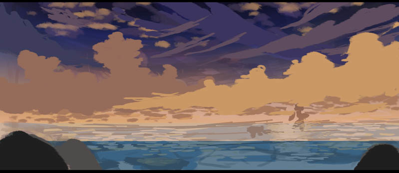 根据场景光照去描绘细节。这里云的立体感画得不怎么样。描绘的时候可以注意明暗对比,大小对比,冷暖对比去使得画面充满细节,就更容易给人感觉画面完成度高。天空到这里就画完了