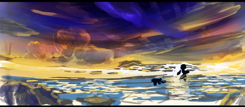 用框选工具建立水面的选区,更改为发光的混合模式画上一层远处海面的亮光,然后顺着光线的效果用水面笔刷随意地刷上一点波纹,当然波纹要刷两种,一种是暗淡的,来源漫反射,一种是明亮锐利的,是来自太阳光的反射。最后根据情况擦一下倒影,海面就画好了