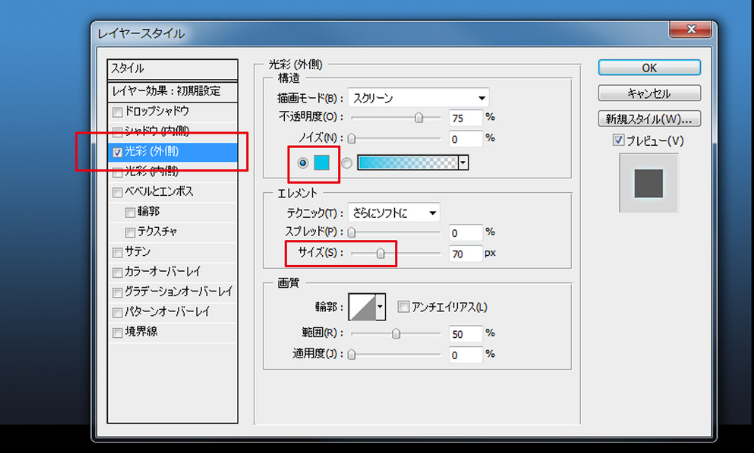 创建新图层以设置图层效果。 勾选光彩(外侧),用调色板选择喜欢的颜色,输入光影响范围的大小的数值