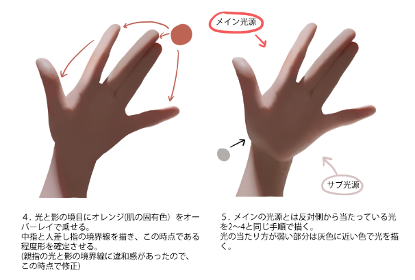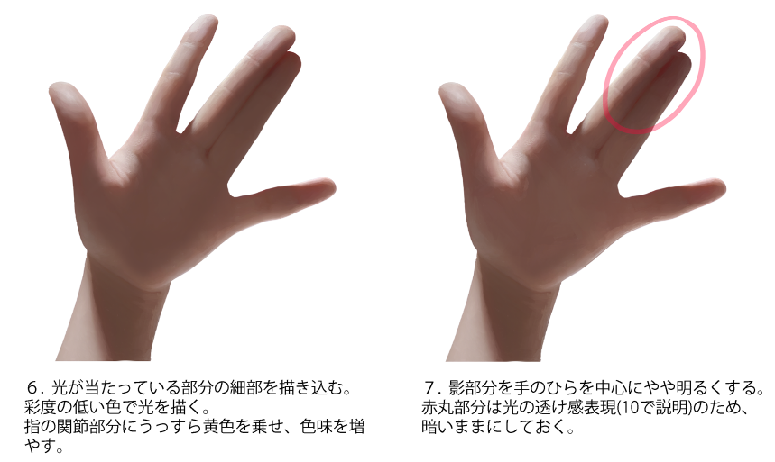 7 .使阴影部分以手掌为中心稍微变亮。红色部分是光的透明感表现(用10说明),所以保持黑暗。