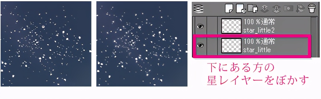 13. 复制小星星图层使之模糊复制11中绘制的星星层,用高斯模糊等方法模糊下方的星星层。小星星整体上看起来柔和地发光。
