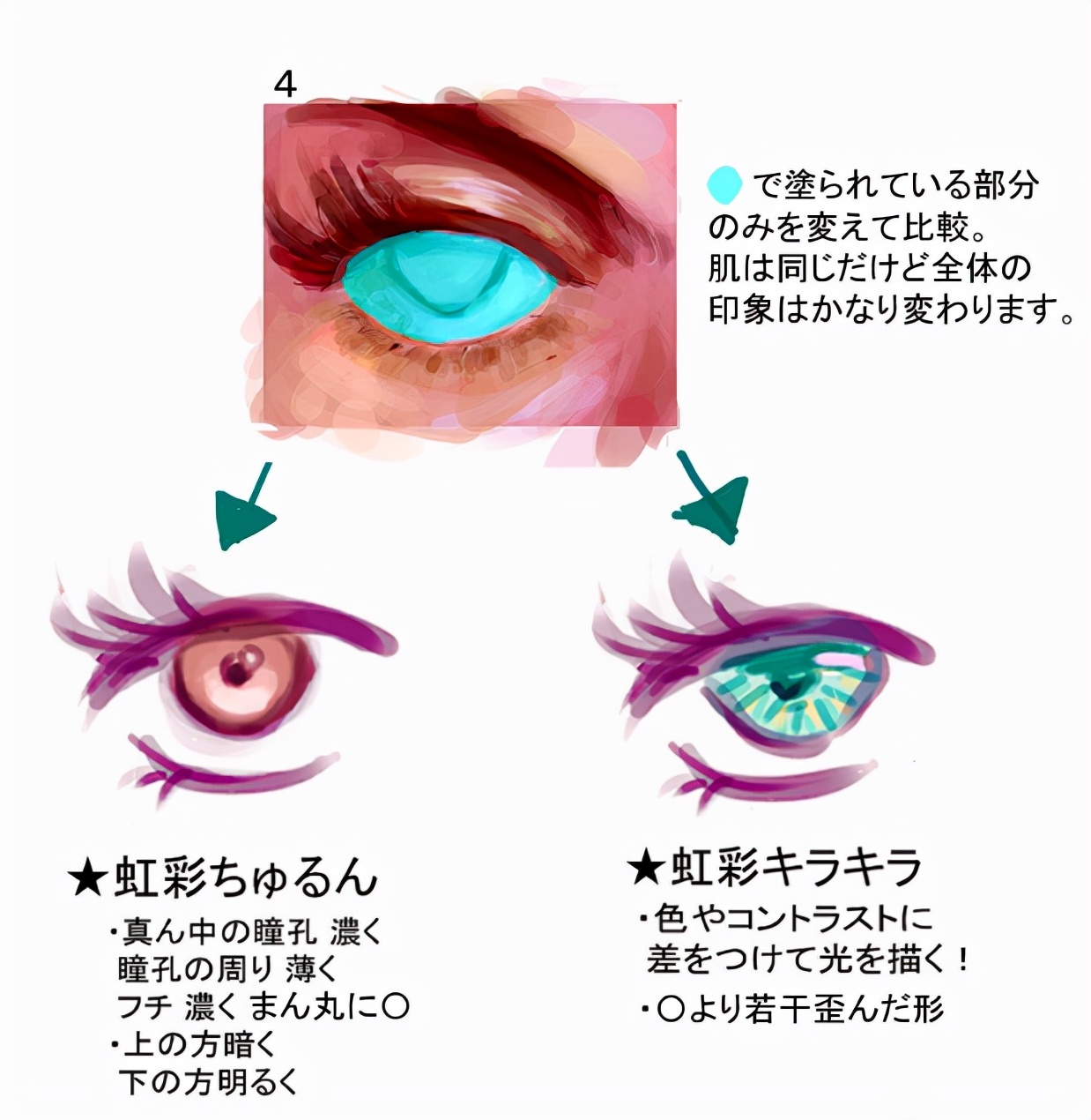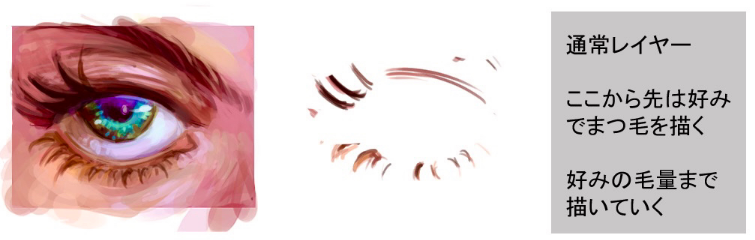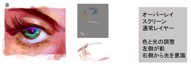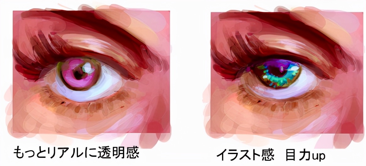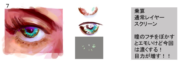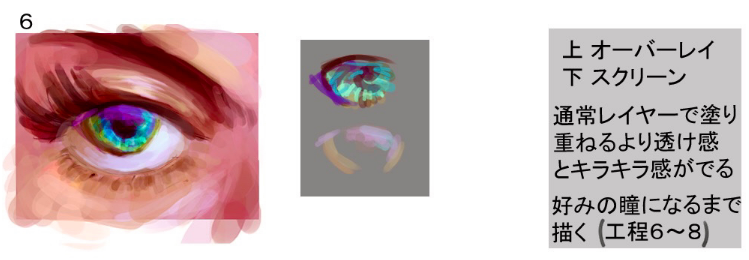 上覆盖下屏幕比起用普通层涂上去,描绘出透明感和闪闪发光的感觉,直到变成自己喜欢的眼睛为止(步骤6~8)