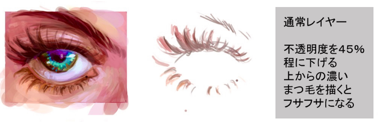 把通常层的不透明度降低到45%左右,从上面开始画浓睫毛的话会变得蓬松
