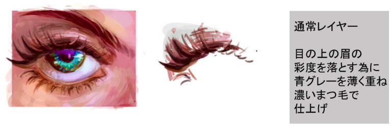 为了降低通常层上眉毛的彩度,用浅灰色重叠的浓睫毛完成