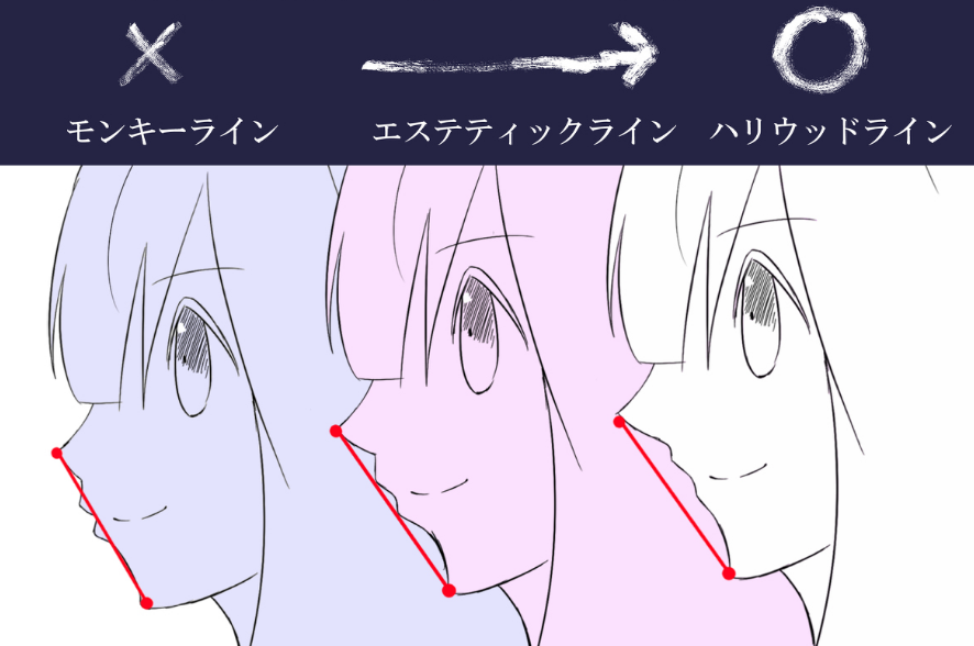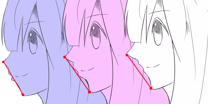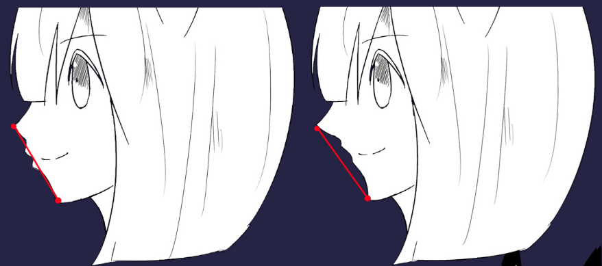用线连接鼻头和下巴的顶部,如果嘴唇从线上露出来的话,只需要将嘴唇缩到脸上就可以了。