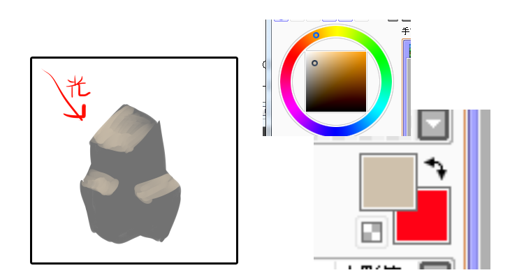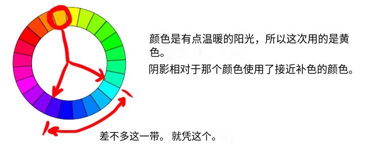 颜色是有点温暖的阳光,所以这次用的是黄色。阴影相对于那个颜色使用了接近补色的颜色。