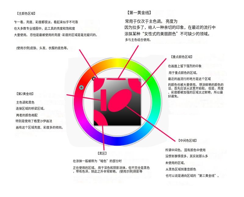 【第2黄金线】连接主色区和黑区的桥梁领域。与这两个区域的颜色搭配得很好,特别是使用了马赛画法的画,这个领域的亮度和饱和度比较多。
