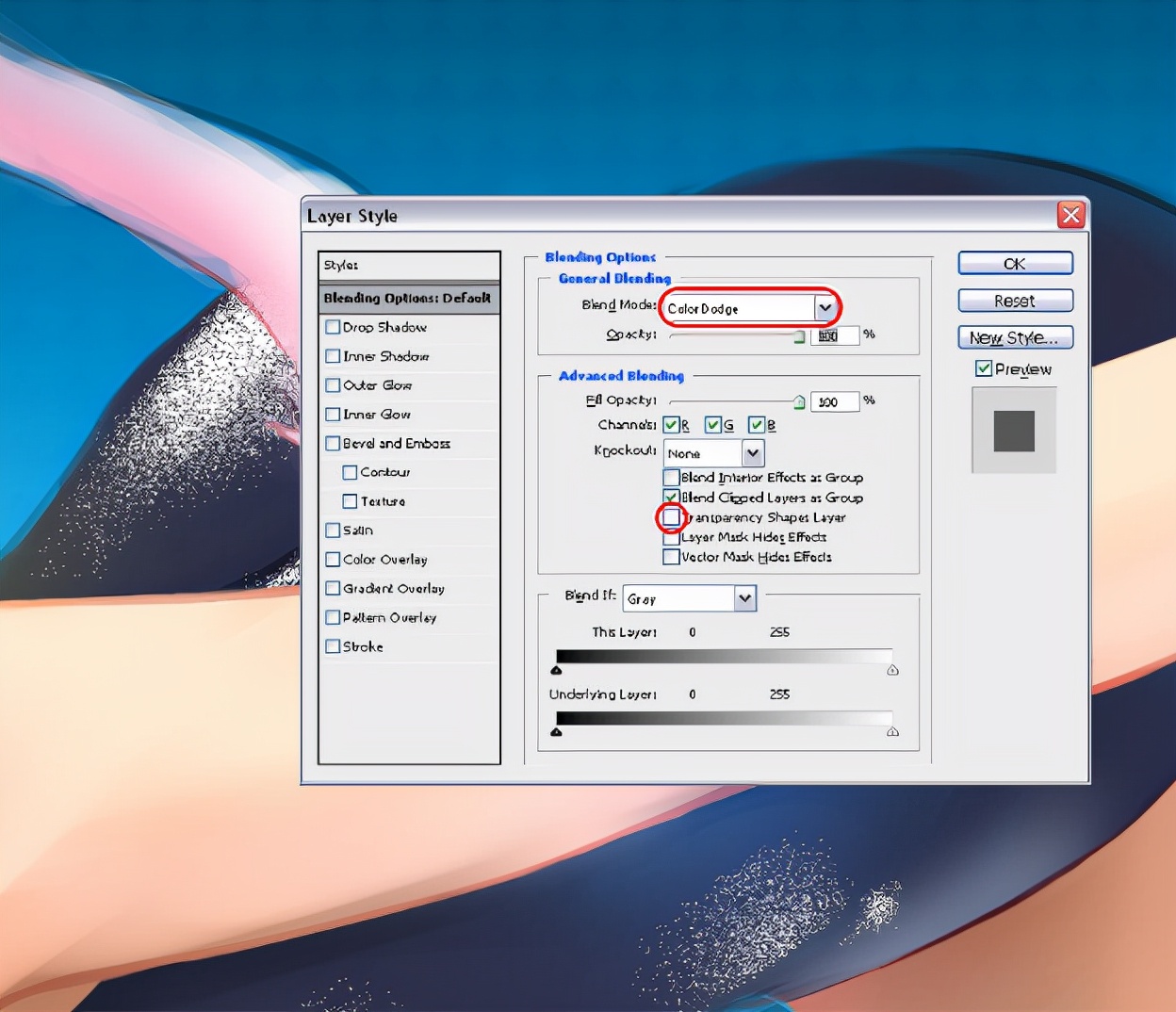 3、将图层模式更改为“颜色减淡”,然后选择“透明形状图层”禁用(透明形状层)的检查