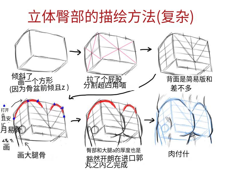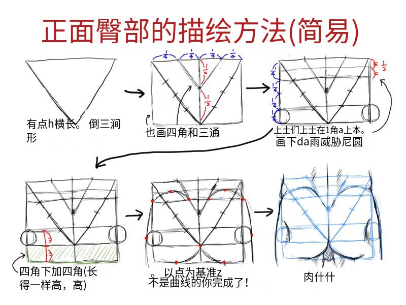 多画几遍,大致了解一下位置,然后按照自己喜欢的形状和比例画出你的屁股。