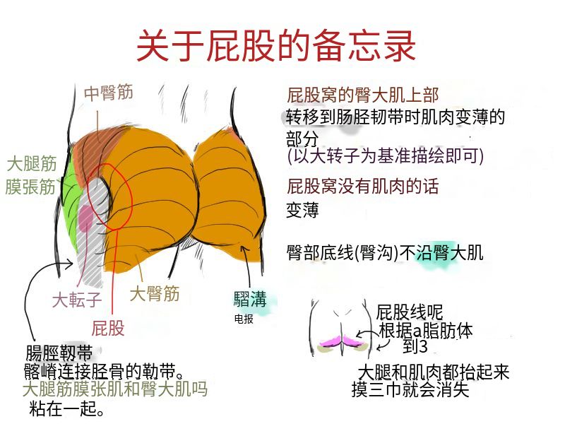 另外,如果改变臀大肌,加上臀中肌和髂胫束的线条,你会得到一个葫芦形或甜椒形的臀部形状。我画的屁股是有男子气概的,所以很丰满。