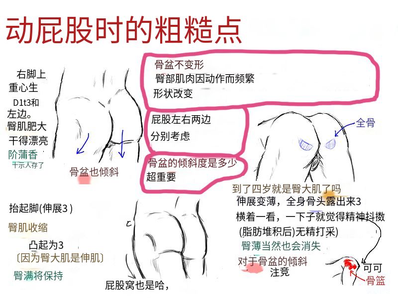 除了画直立的站立图时,还要考虑骨盆的倾斜和肌肉的收缩,沿着肌肉分开、牢固地画出左右臀部的形状。