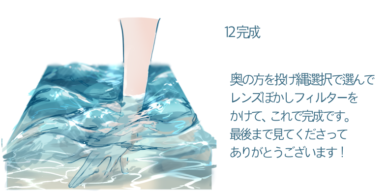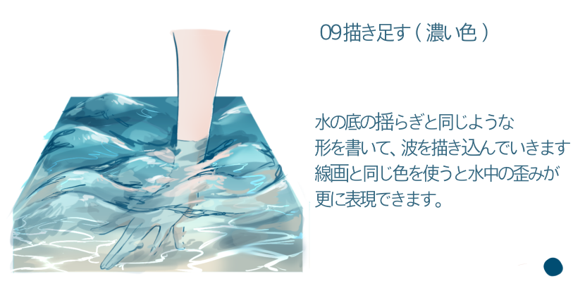 画出与水底晃动相同的形状,然后画入波浪,使用与线描相同的颜色,可以进一步表现水中的歪斜。