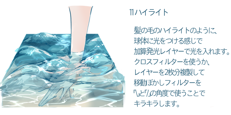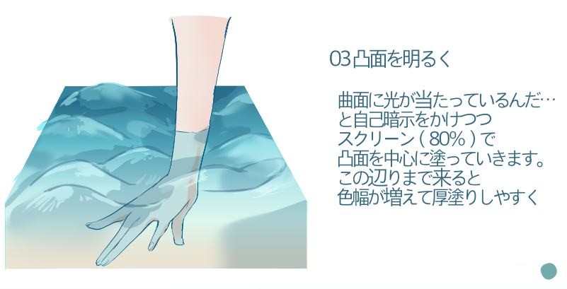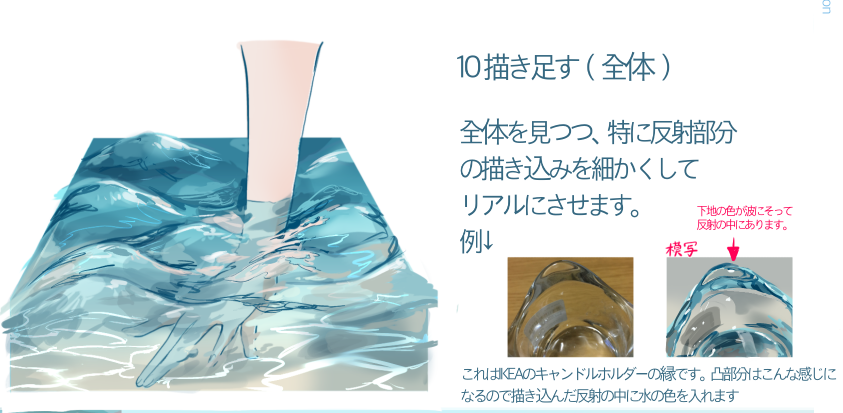 因为凸部有这样的感觉,所以在描绘的反射中加入水的颜色