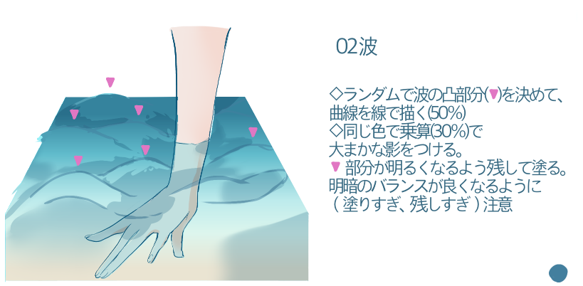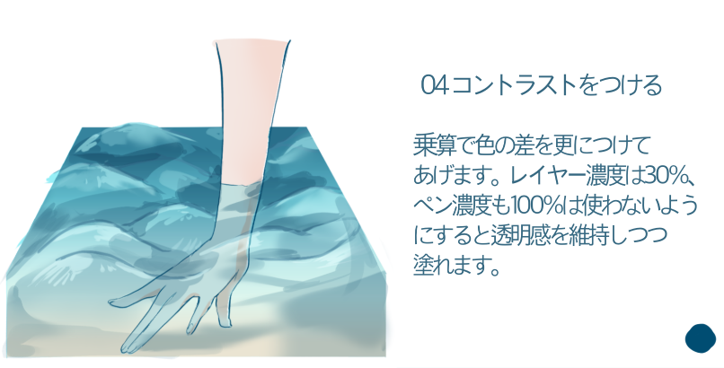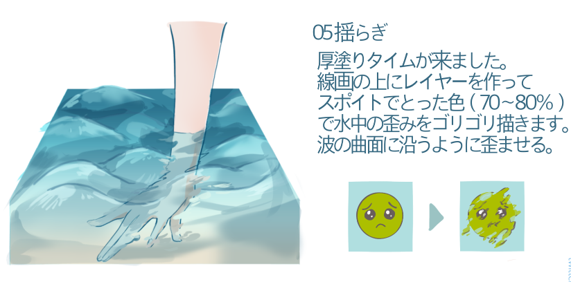 厚涂开始,制作线由的上图层,用聚光灯取的颜色(70~80%)强烈描绘水中的歪斜。沿着波浪的曲面使之歪斜。