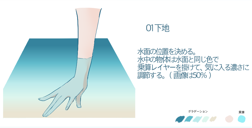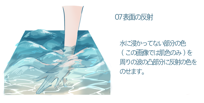 将未浸入水中的部分的颜色(仅此图像中的色调肤色)涂上周围波浪的凸部反射的颜色。